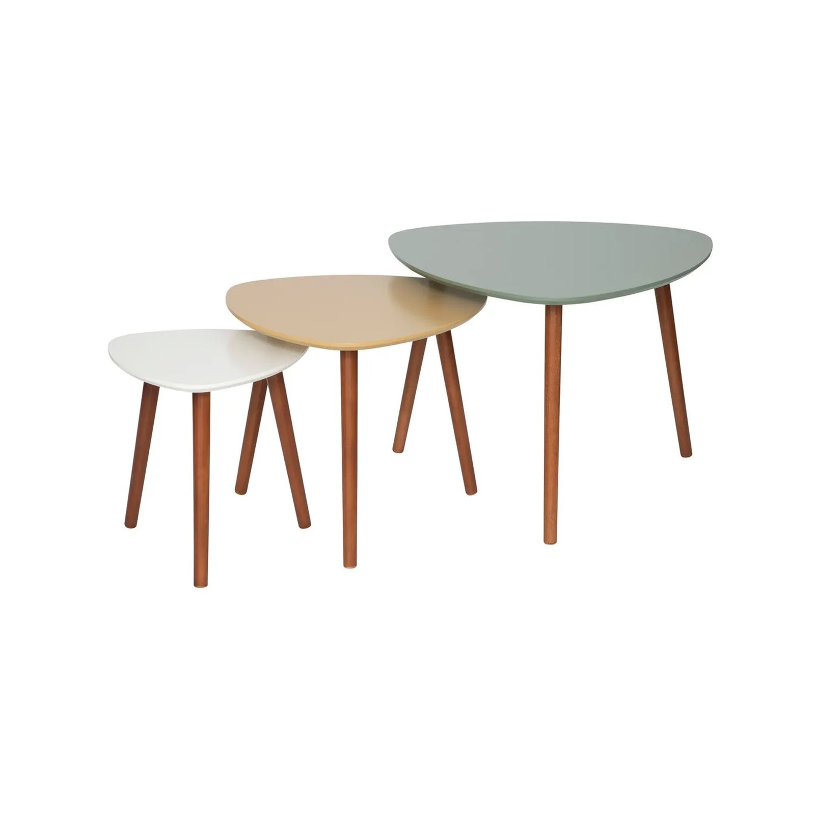 This nesting table set adds a pop of color to any living space. With a vibrant mix of green, ochre yellow, and white, these tables are not only functional but also a statement piece. Perfect for entertaining and daily use alike, these tables are a must-have for any home.