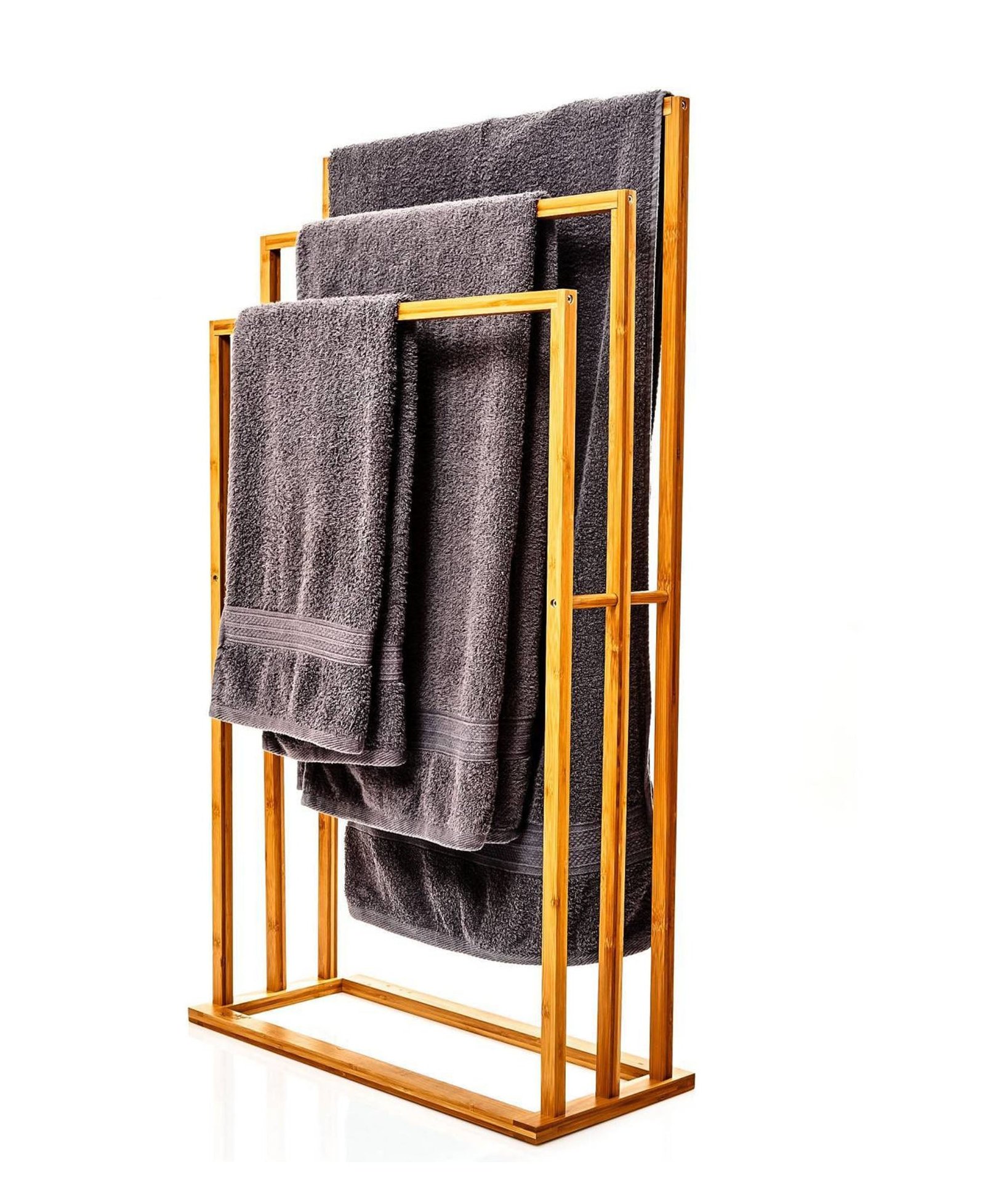 Organize your bathroom with this bamboo towel rack. This stable, natural-colored towel holder, in a modern design, offers space for hanging and drying bath towels, hand towels, face towels, etc.