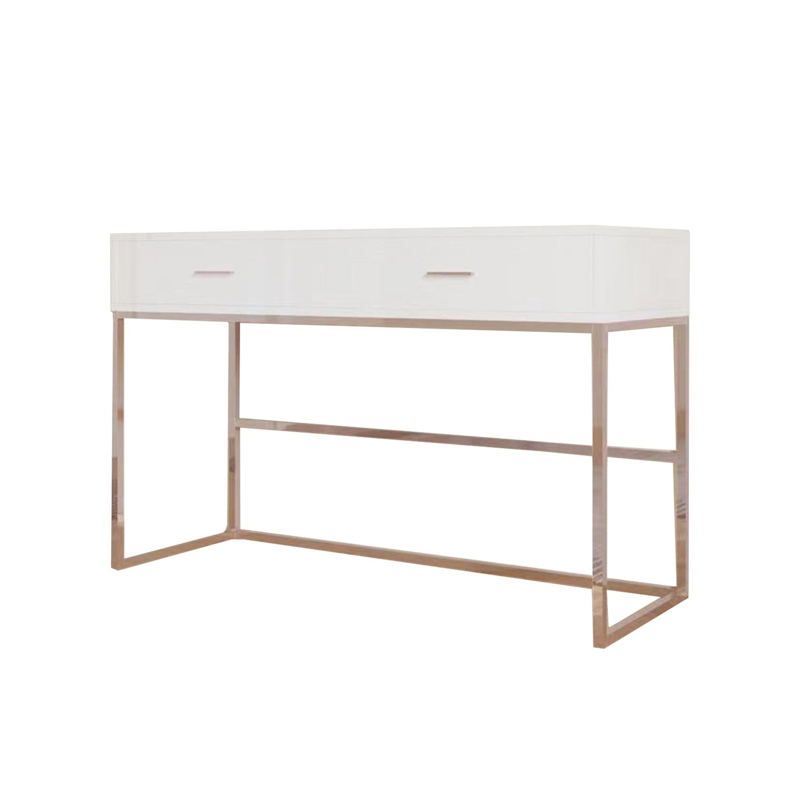 Elevate your dressing routine with our Exotic Designs White + Rose Gold Dressing Table. Experience contemporary elegance with its sleek white finish and striking rose gold legs. Two spacious drawers offer easy access and ample storage for your essentials. The minimalist design effortlessly enhances any bedroom or dressing area.