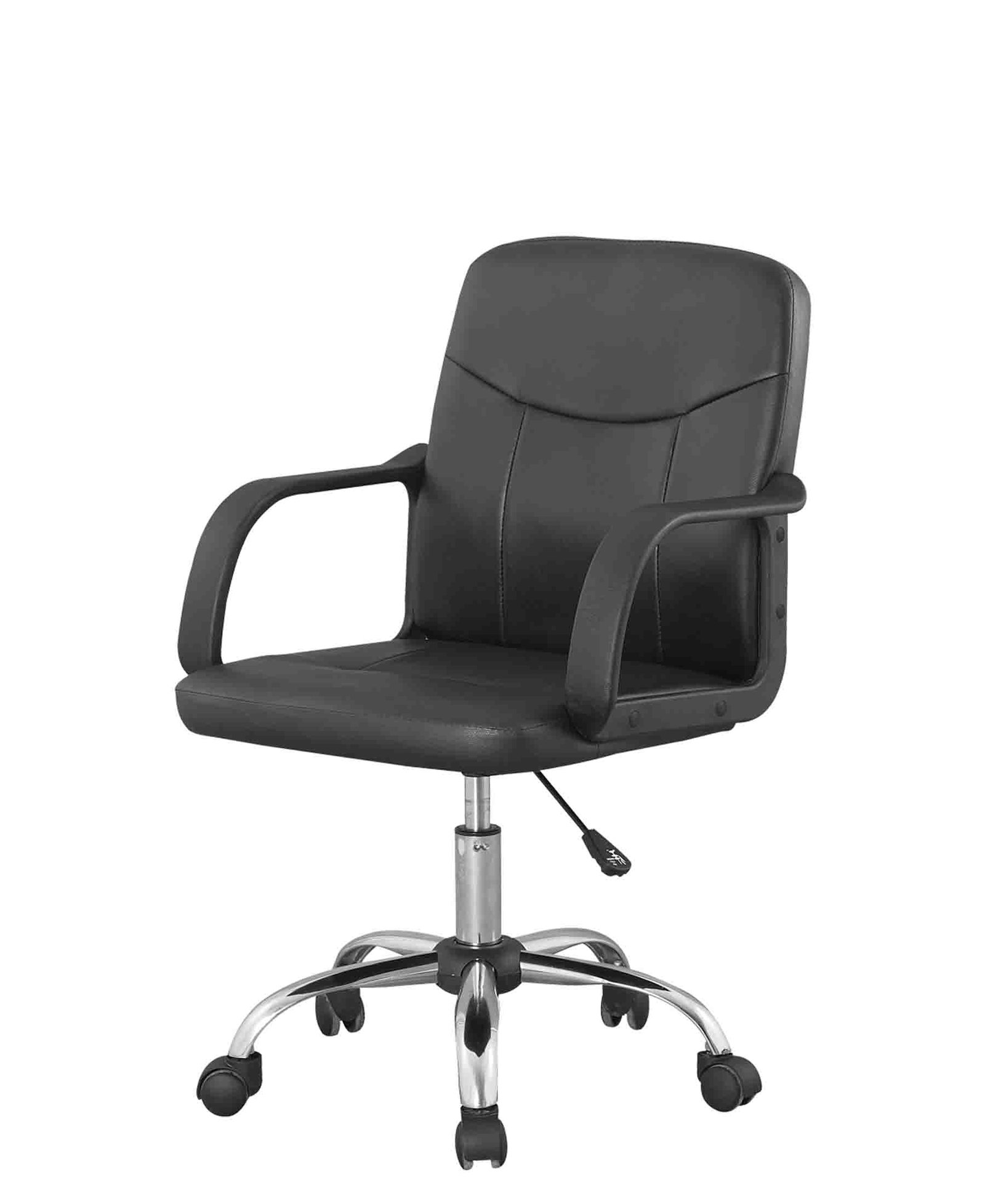 Managers chair with adjustable seating, rectangular shaped arm rest, chrome finish legs with wheels.